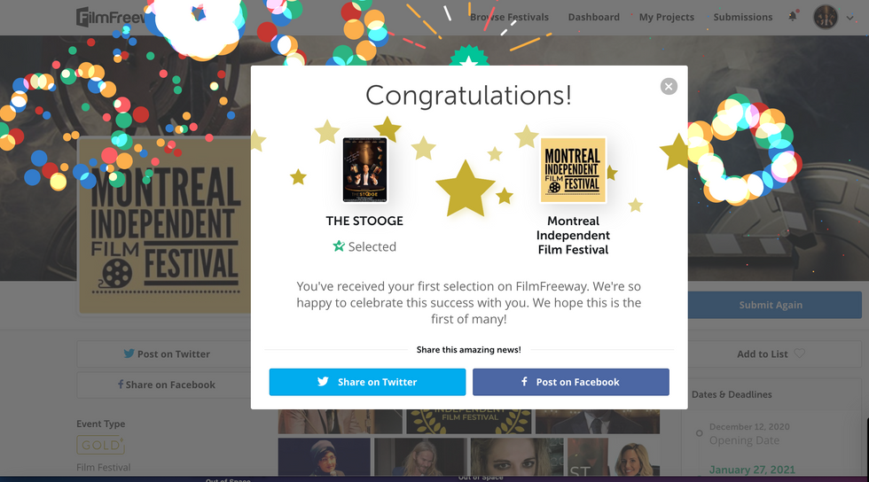 Happy with (and honored by) "The Stooge" being an Official Selection of the 2021 MONTREAL INDEPENDENT FILM FESTIVAL.